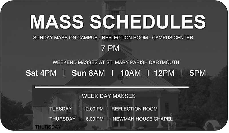 The shuttle departs at 9:30 am from the Campus Center for 10:00 am services at all three churches. The shuttle returns to UMass Dartmouth at 11:15 am.